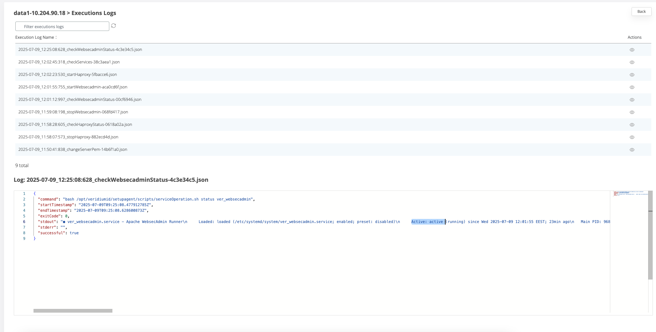 In the Execution Logs list check the log for the “check<serviceName>Status” command by clicking the view icon