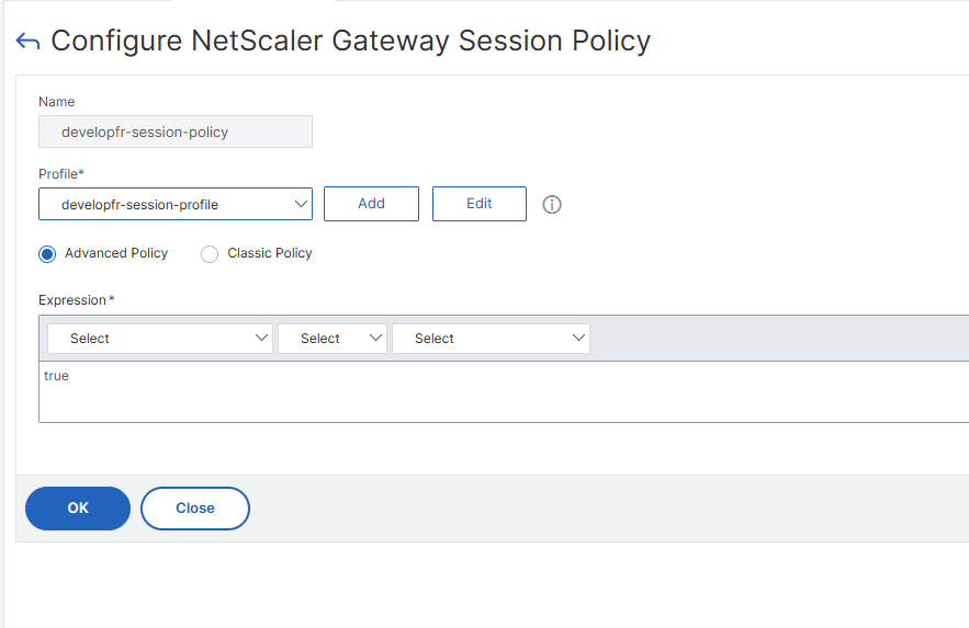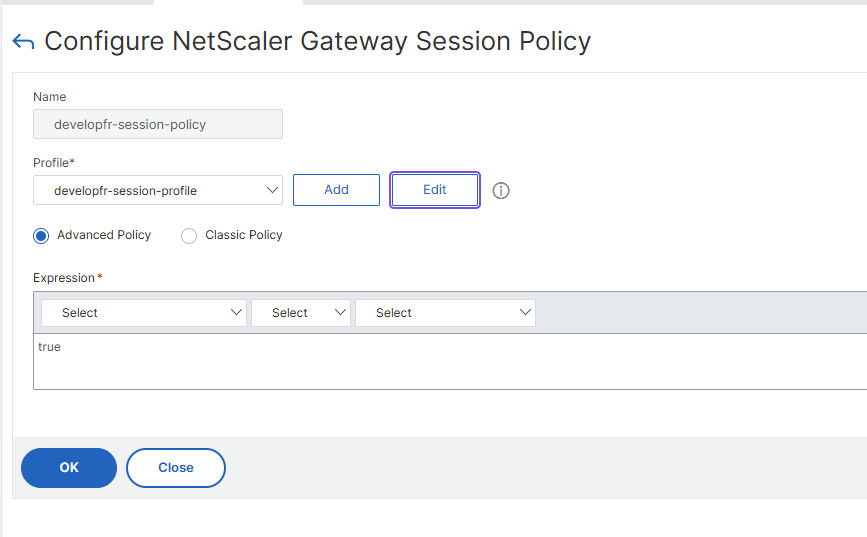 Next, we need to modify the session policy attached to the Netscaler FreeRadius virtual server in order to allow a certain group (ori groups) to login. For this, in the Netscaler main menu, go to Netscaler Gateway->Policies->Session