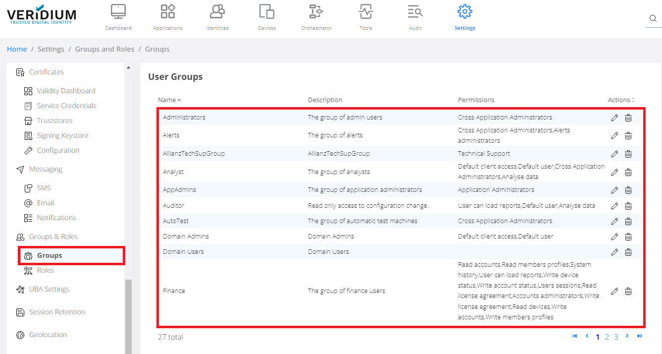 Veridium Group overview is in Home/Settings/Groups and Roles/Groups.
