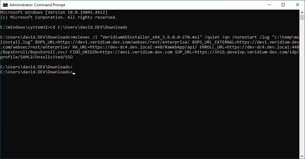msiexec /i "VeridiumADInstaller_x64_3.6.0.0-270.msi" /quiet /qn REBOOT=ReallySuppress /log "c:\temp\msiinstall.log"