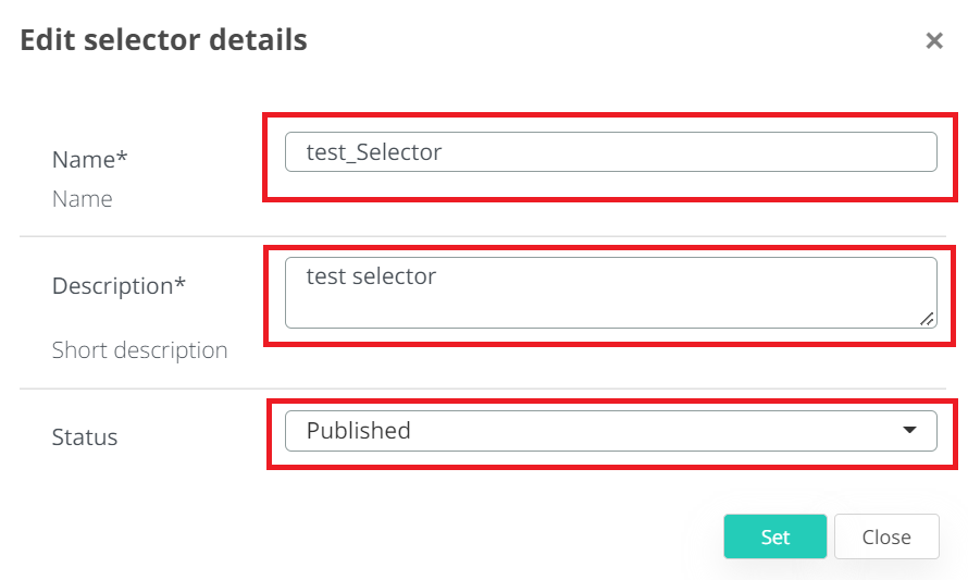 Edit the selector’s properties in the configuration pane that contains the name, description and status displayed on the top-left side.