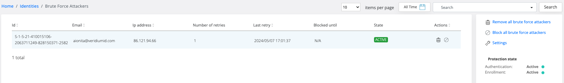 If protection against brute force is chosen, the legitimate user can still have access to the services even if an attacker tries to compromise his identity, because the attacker will be blocked on all the IPs with which he tries to compromise the identity.