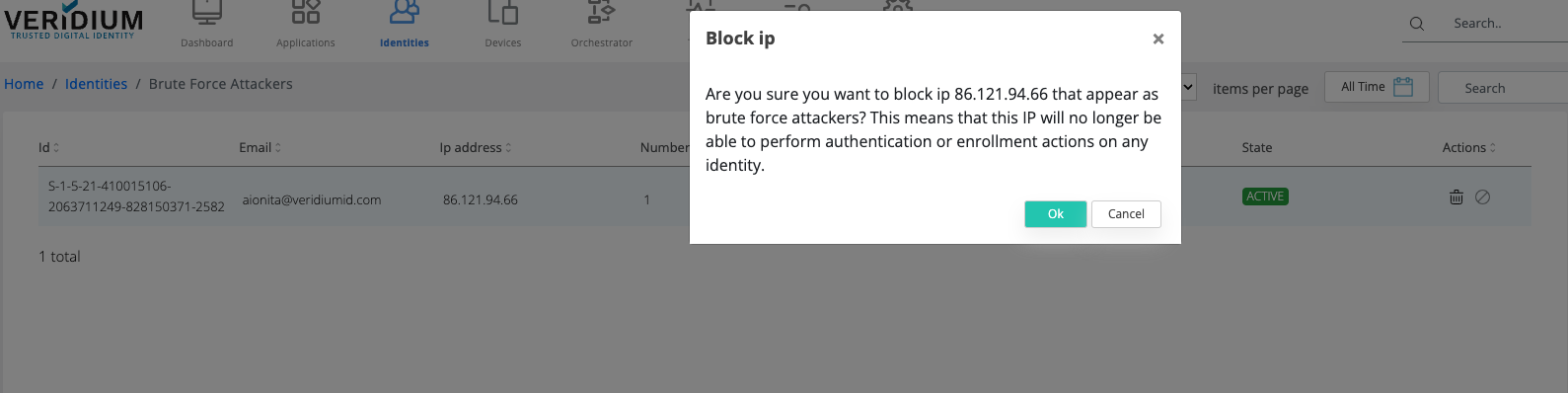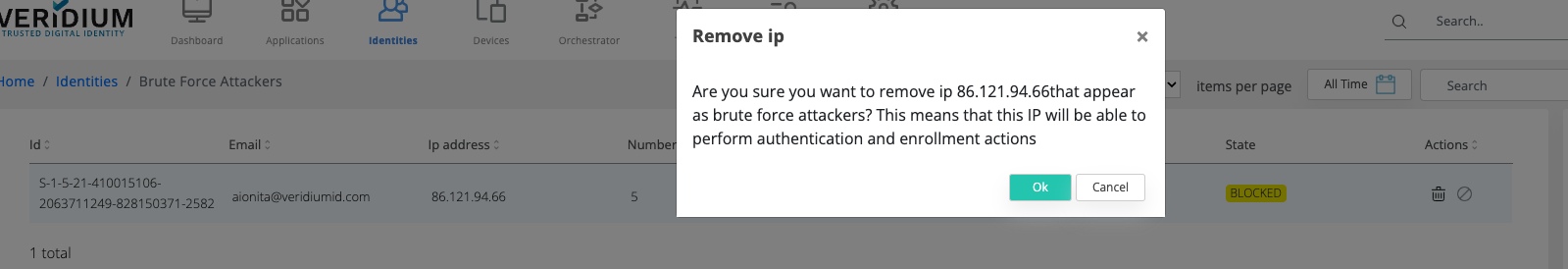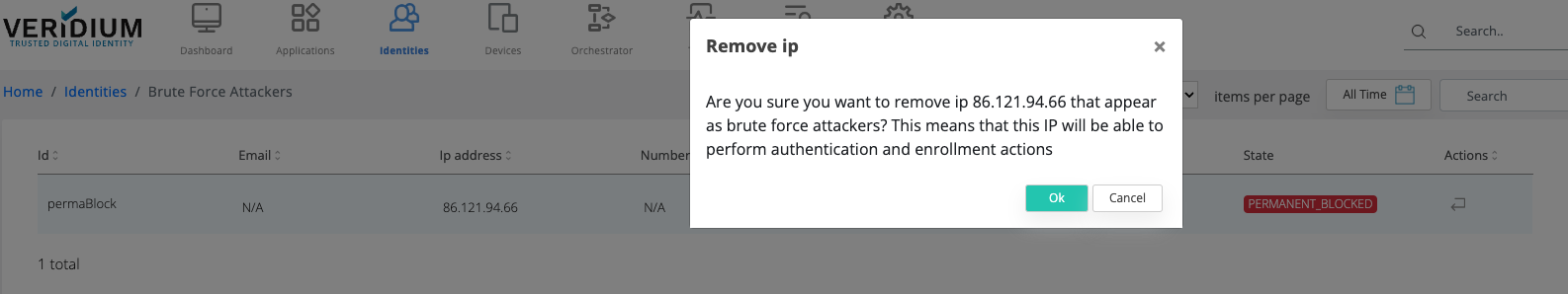 This action will block that IP for all present identities, and no identity will be allowed for enrolment/authentication coming from that IP address.