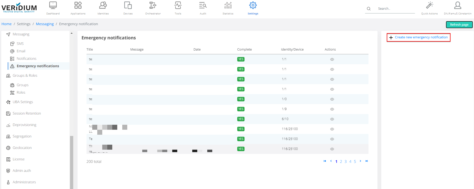 The first section presented to the user contains the list of past emergency notifications, sorted by Title, Message, Date, Complete Status, Number of identities and devices for delivery. Sender account and eventual filters used are displayed in a pop-up triggered by Actions eye button.
