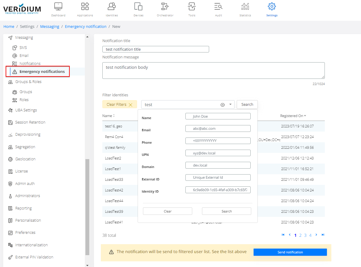 To configure a new emergency notification, access the right-side link. In this edit window, title and text (max 1024 chars) are mandatory. Filtering is available for identities, using the same mechanism as in identity search.