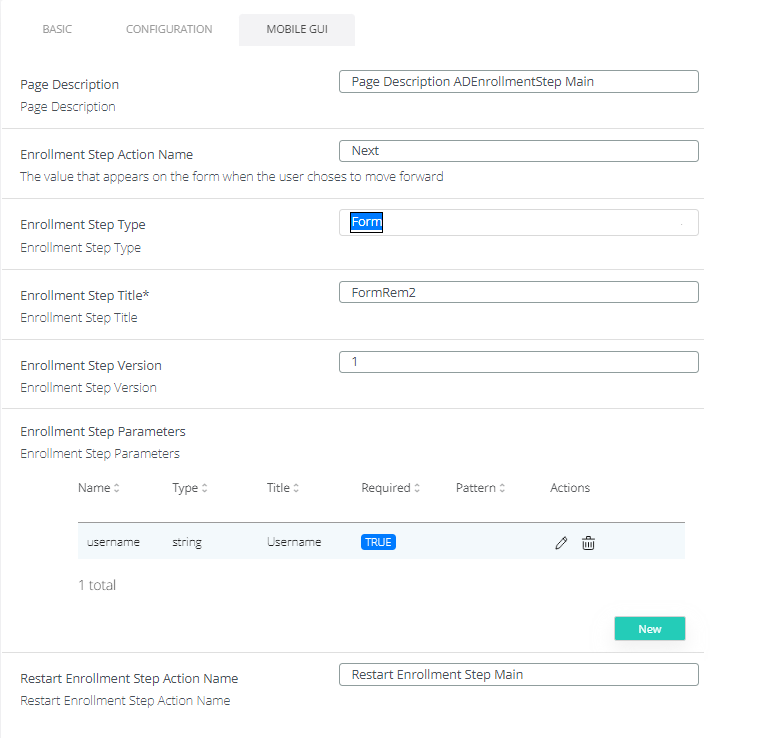 Enrollment Step Type | Defines the type of enrolment step, i.e. “Form” defines a screen where user input is expected | Form |
