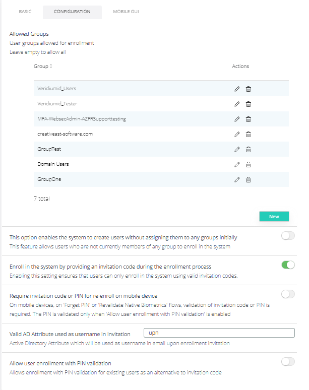 User enrollment via invitation code - Restrict users to enroll only using invitation codes | Main setting that will enable invitation code as a hard requirement for the enrolment process. | OFF |