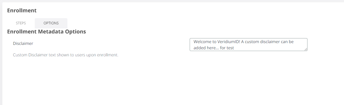 Enrollment Metadata Options | Custom Disclaimer text shown to users upon enrollment. | Welcome to VeridiumID! A custom disclaimer can be added here... |