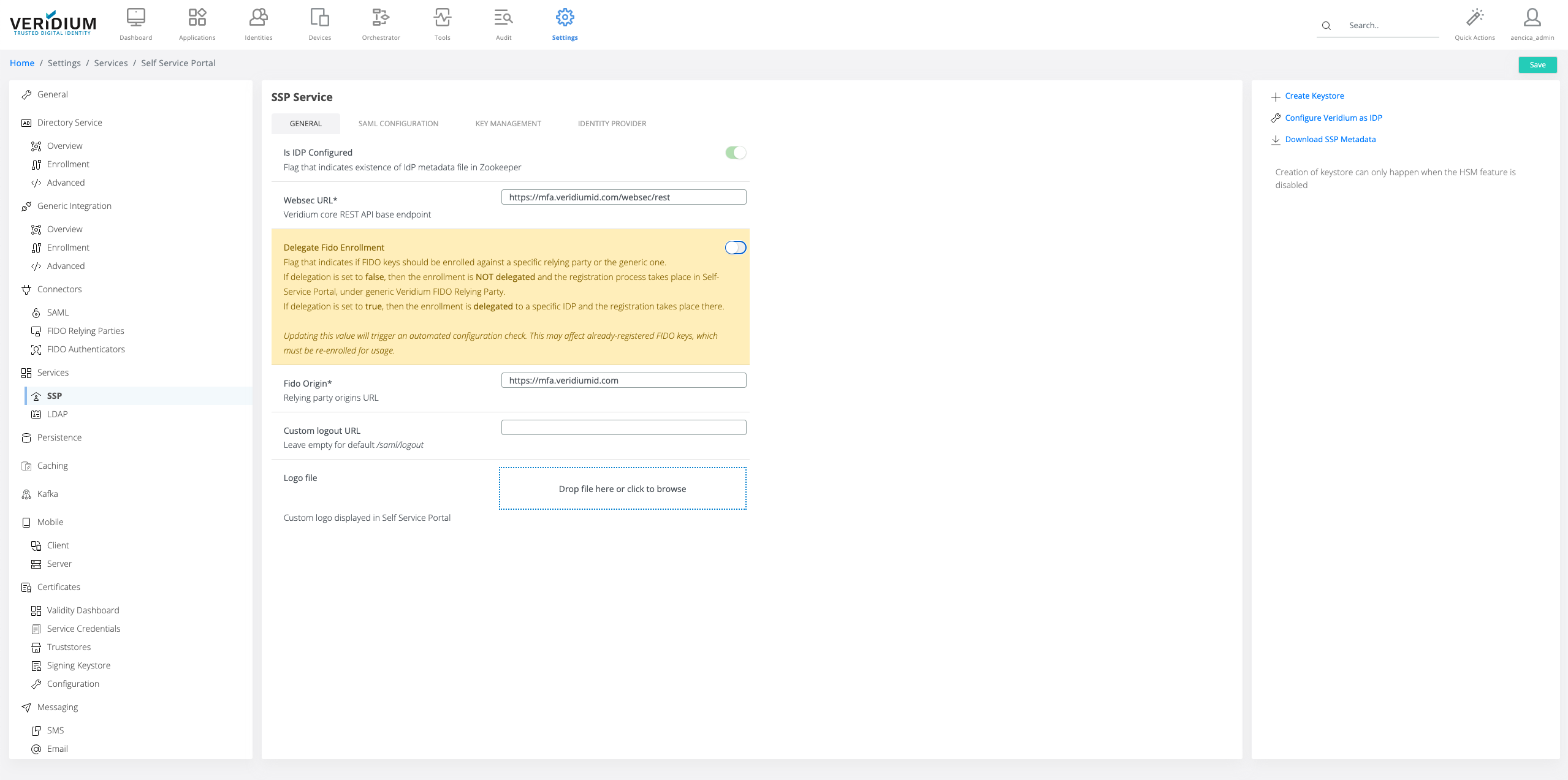 Using Veridium Manager: Settings/Services/SSP the following settings should be configured: