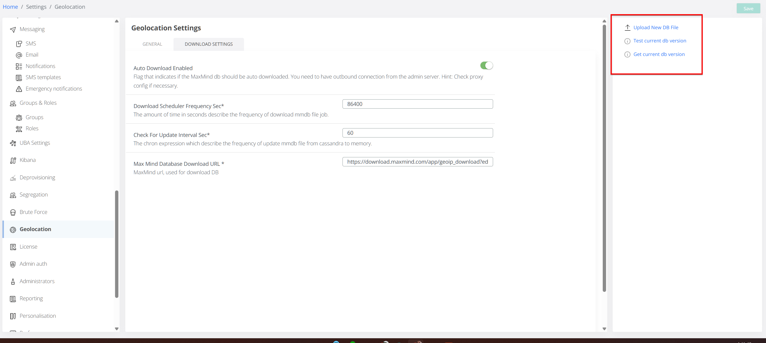 Geolocation - Download Settings Tab: Manages the geolocation database, including update frequency, download URL, manual uploads, testing, and version information.