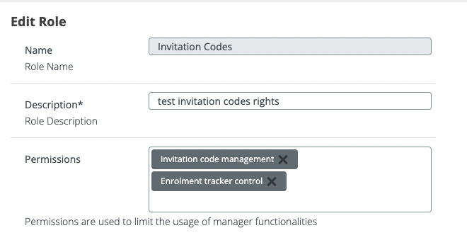 In pevious versions the Techsupport role encompassed most of the actions related to these functionalities. However, to enhance control and provide a more detailed management approach to the application, specific permissions have been introduced for Invitation Code Management and Enrolment Tracker Control . These permissions can now be configured individually under Settings → Groups and Roles → Roles.