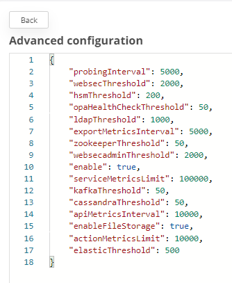 Metrics: it presents the response time of different services. The results can be found in files, if the variable enableFileStorage from websecadmin → settings → Advanced → metrics.json is set to true. See chapter VeridiumID Health Check mechanism, to setup different values for metrics thresholds.