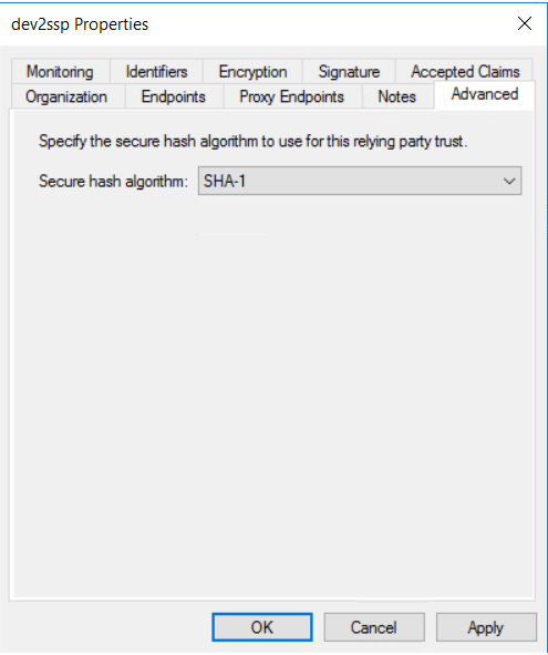 In the Advanced section, select SHA-1 as secure hash algorithm, then click on Apply and OK: