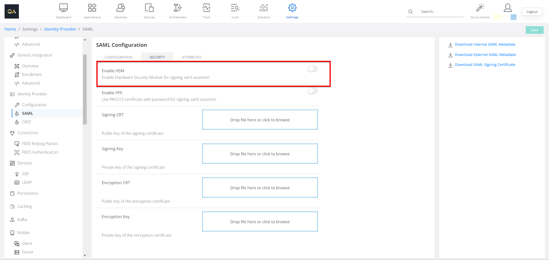 1. Navigate to the Admin Dashboard → Settings → SAML Configuration → Security & Keys and enable the HSM toggle: