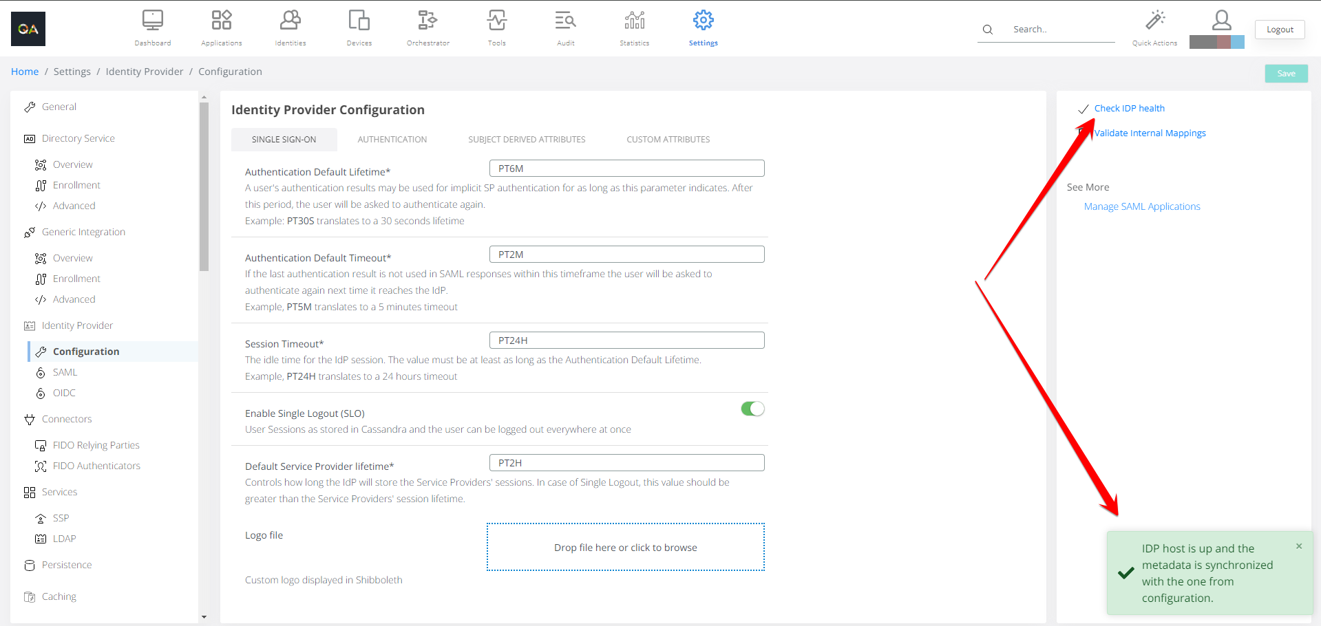 Default Service Provider lifetime* | Controls how long the IdP will store the Service Providers' sessions. In case of Single Logout, this value should be greater than the Service Providers' session lifetime. | PT2h |
