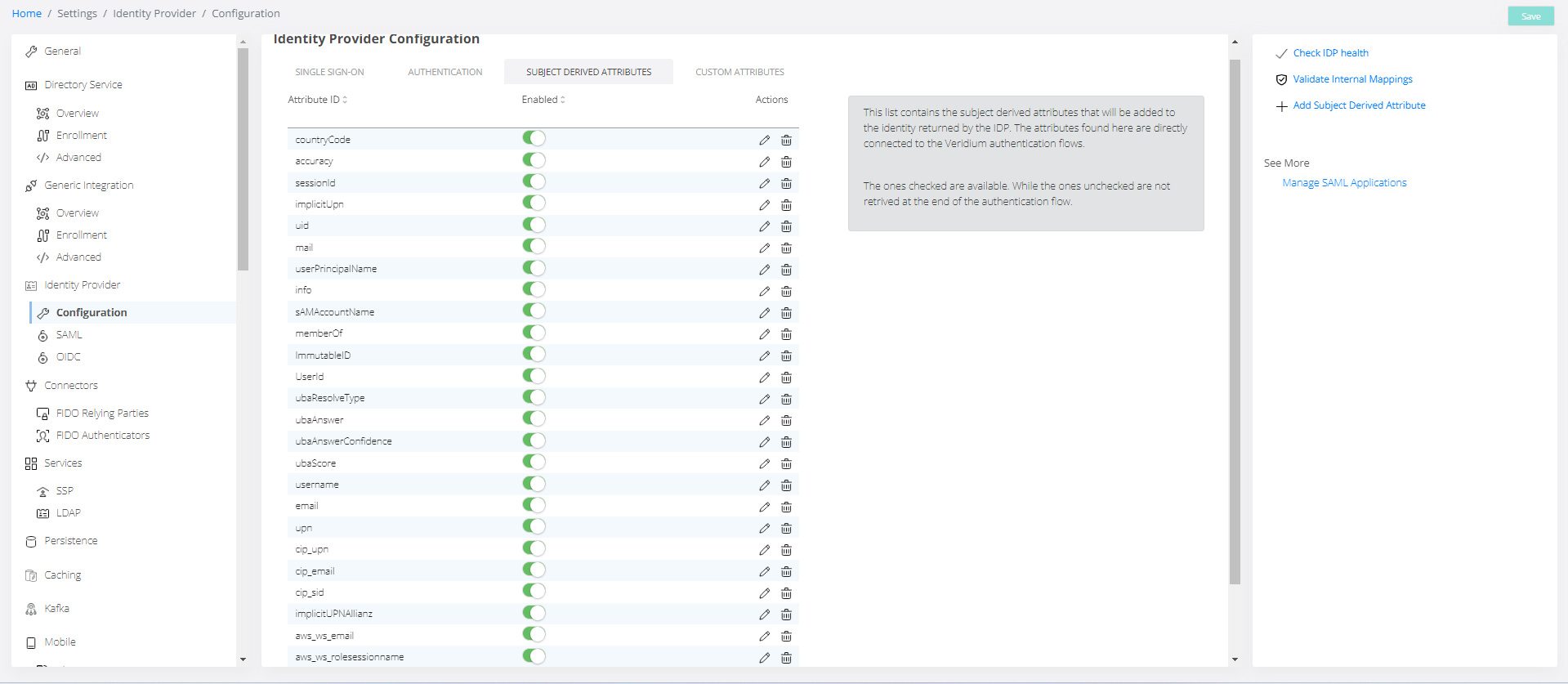 This list contains the subject derived attributes that will be added to the identity returned by the IDP. The attributes found here are directly connected to the Veridium authentication flows.