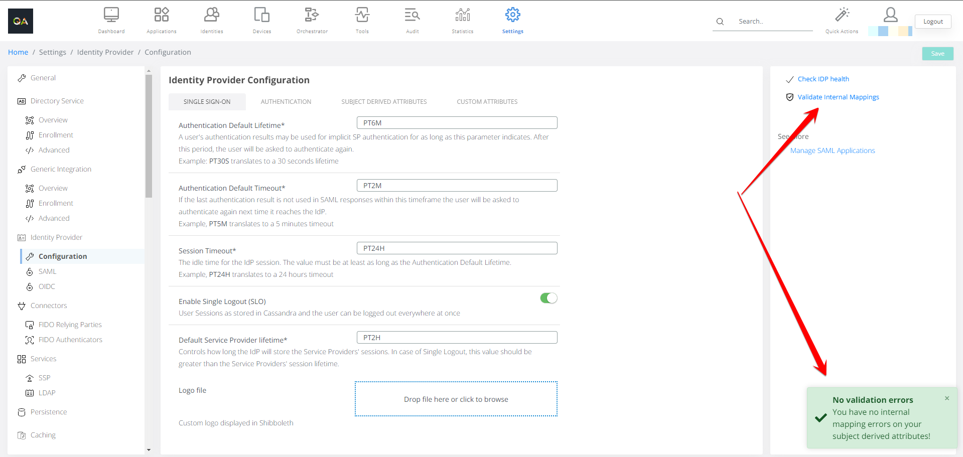 Enable Single Logout (SLO) | User Sessions as stored in Cassandra and the user can be logged out everywhere at once | Turned off |