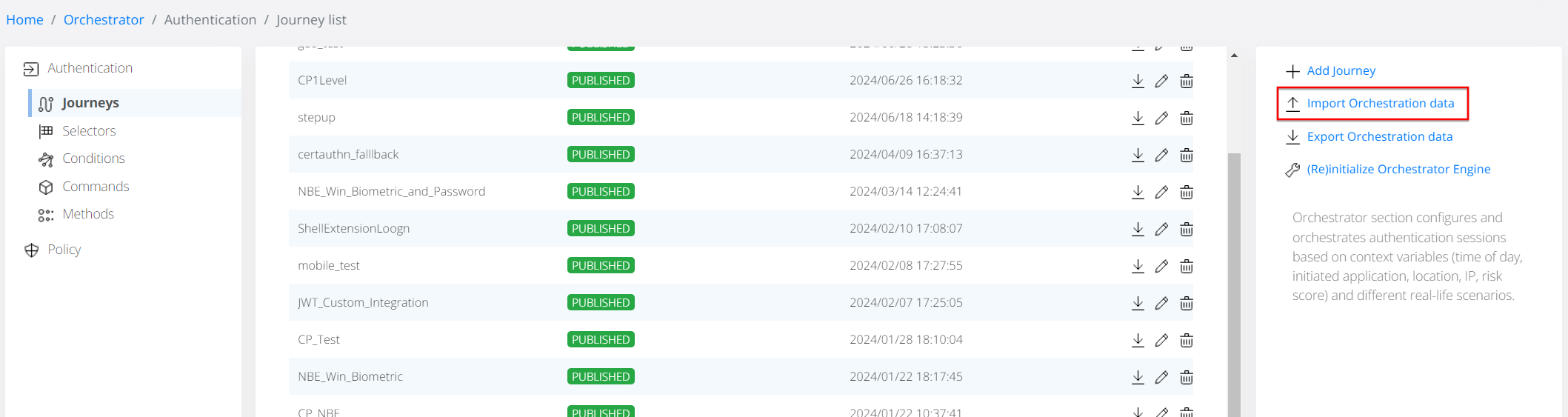 In Veridium Manager, click Orchestrator on top navigation. The list of existing journeys is displayed.