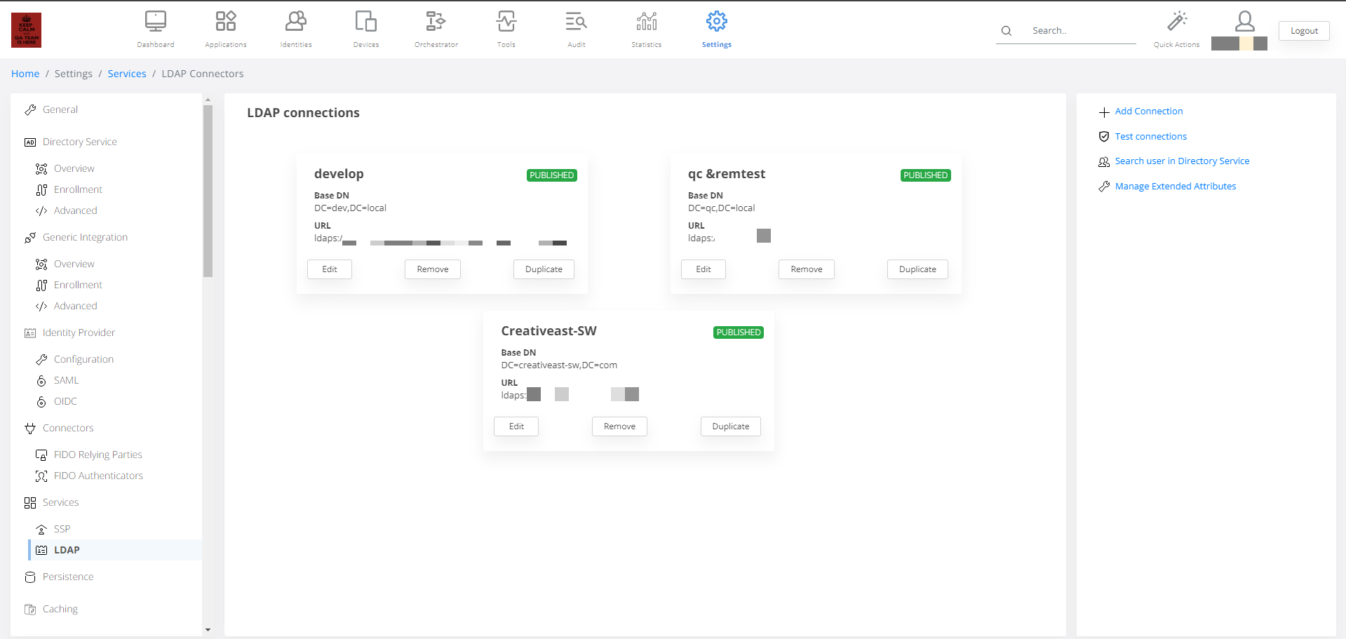In this section an admin has to add the company LDAP and then he can operate connection attributes, duplicate and test the connection itself.