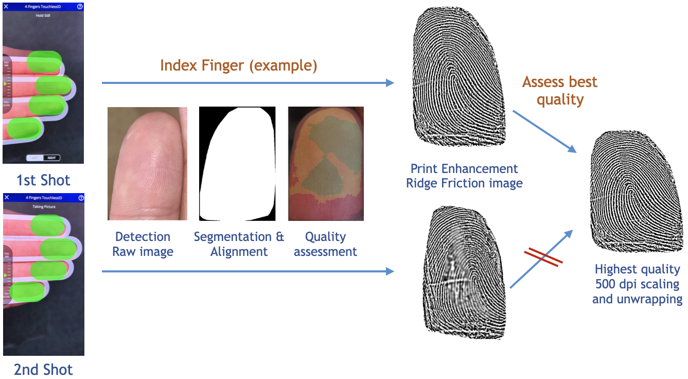 Two Shot Capture: Users are guided to position their hand optimally for two shots, the best quality prints are retained (This is in addition to per-shot quality checking).