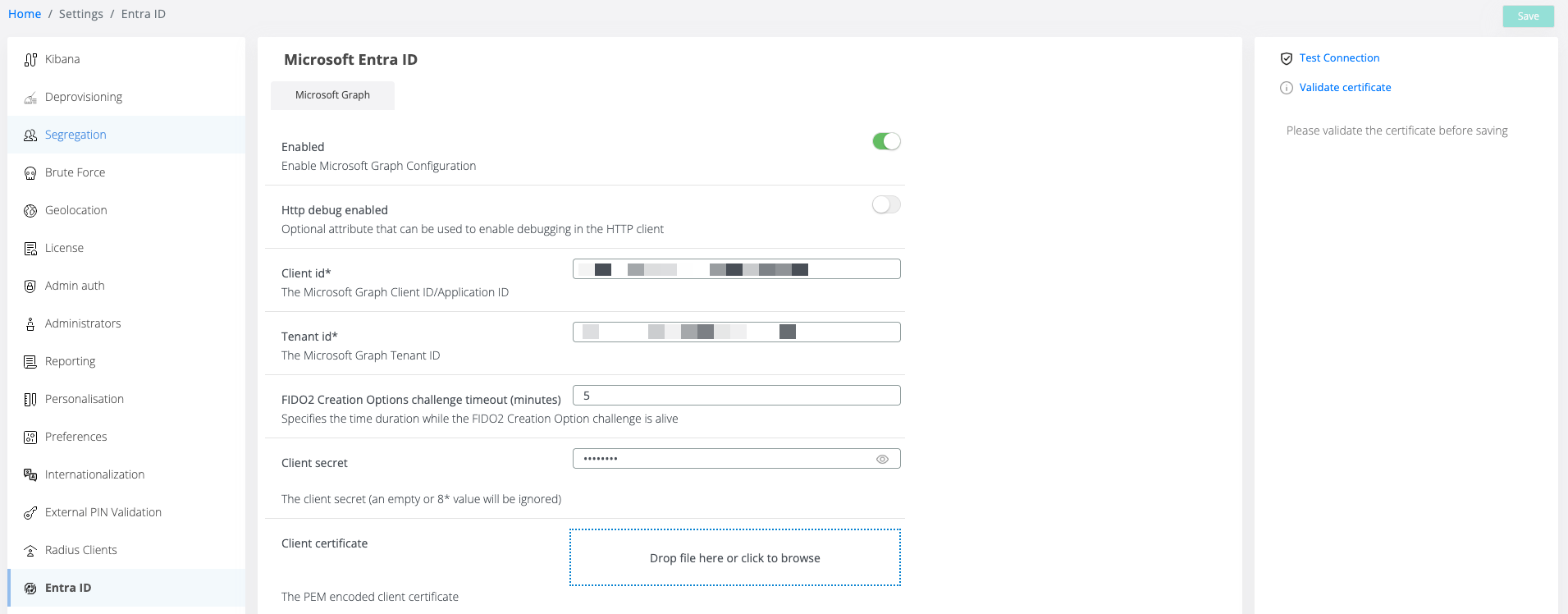 This section of the Veridium Manager allows you to configure integration with Microsoft Entra ID using Microsoft Graph API. It enables secure communication between the Veridium platform and Microsoft services for managing authentication-related tasks.