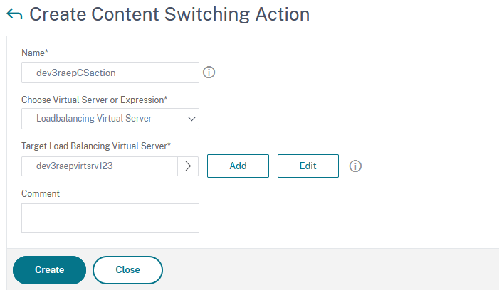 Go to Traffic Management → Content Switching → Actions and click on Add: