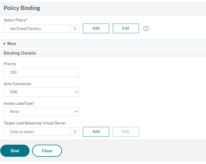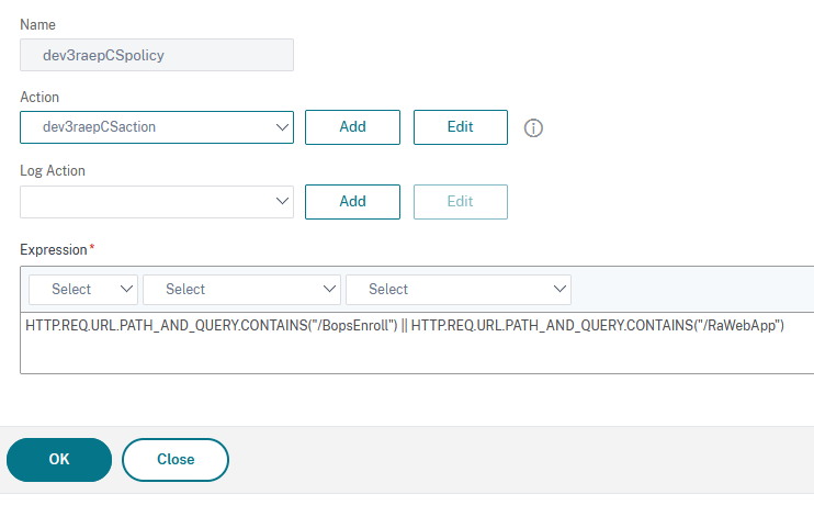 Type in a name, select the previously defined action from the drop-down list in the Action section and type HTTP.REQ.URL.PATH_AND_QUERY.CONTAINS("/BopsEnroll") || HTTP.REQ.URL.PATH_AND_QUERY.CONTAINS("/RaWebApp") in the Expression field: