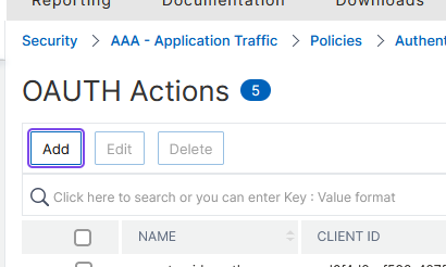 This step must be performed in the Netscaler GUI (or the CLI). Tipically the OAUTH action is defined at the Authentication profile creation during the virtual server configuration process. However, the OAUTH action can also be defined manually by performint the following steps: