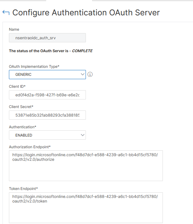 In the next window type in a Name for the action, Select GENERIC in the OAuth Implementation Type field, the fill in the Client ID and Client Secret defined previously in Entra. Set Authentication to ENABLED, then fill in the Authorization Endpoint and Token Endpoint from Entra