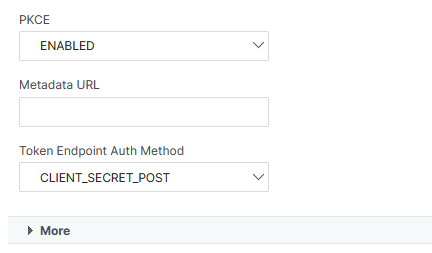 Scroll down and set PKCE to ENABLED, Token Endpoint Auth Method to CLIENT_SECRET_POST and then click on More: