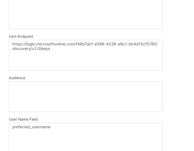 Moving further down the page, fill in the Cert Endpoint field with the value extracted from Entra endpoints and then set the User Name Field to preferred_username (this is the username attribute in the token):