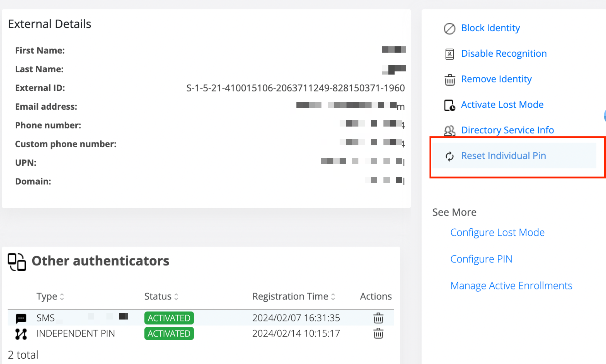 The new permission that will grand the power to reset the PIN for a identity can be separately added to the desired group (eg TechSupport) and the Administrators and AppAdmins will have this permission integrated. Those that have the new permission will be able to see the reset action button and click on it.