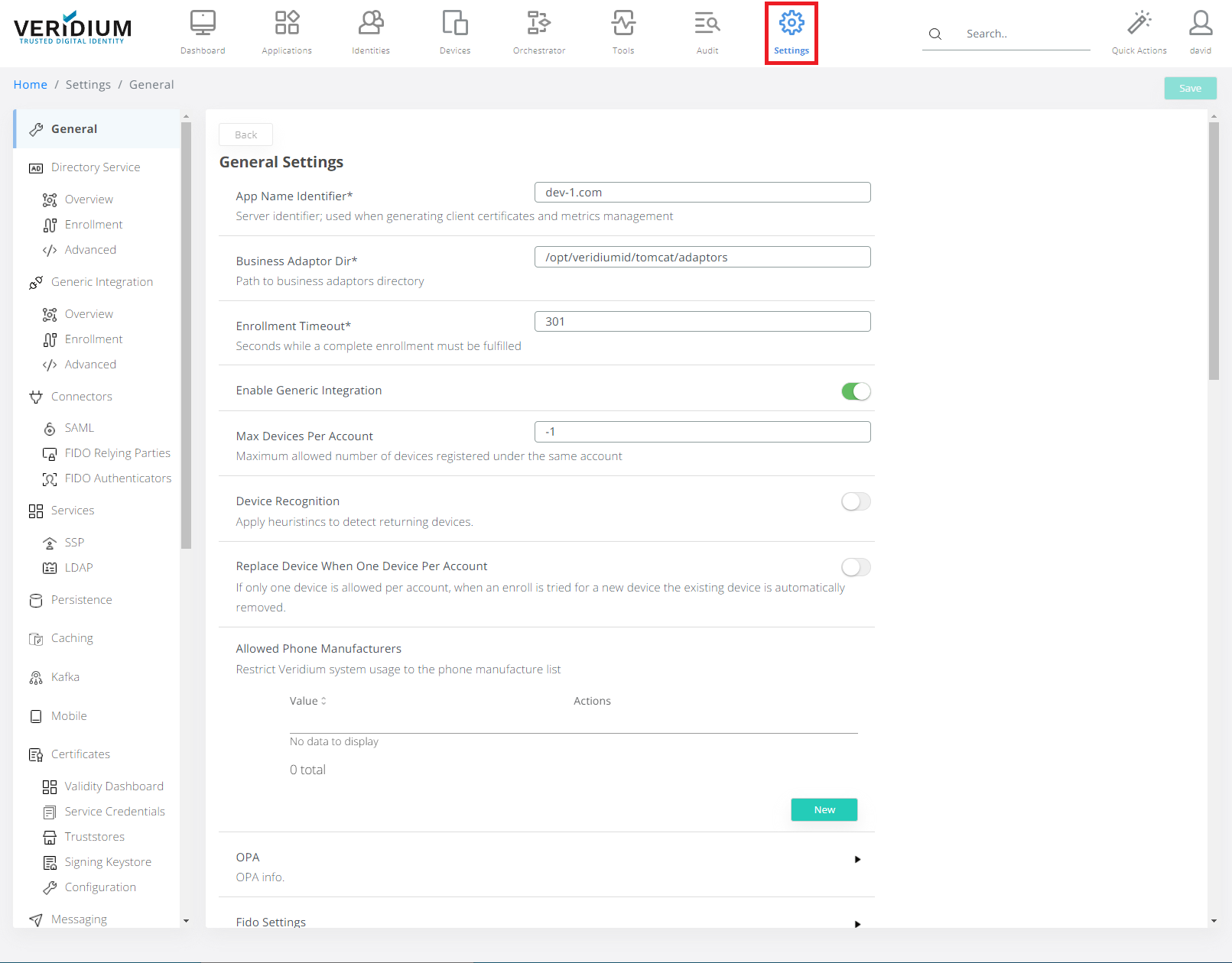 In Veridium Manager, click Settings on top navigation.