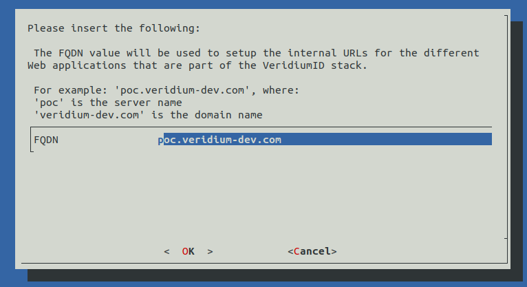 Write the correct EXTERNAL FQDN in place of ext-poc.veridium-dev.com and press the TAB key to go to OK and press Enter to continue.