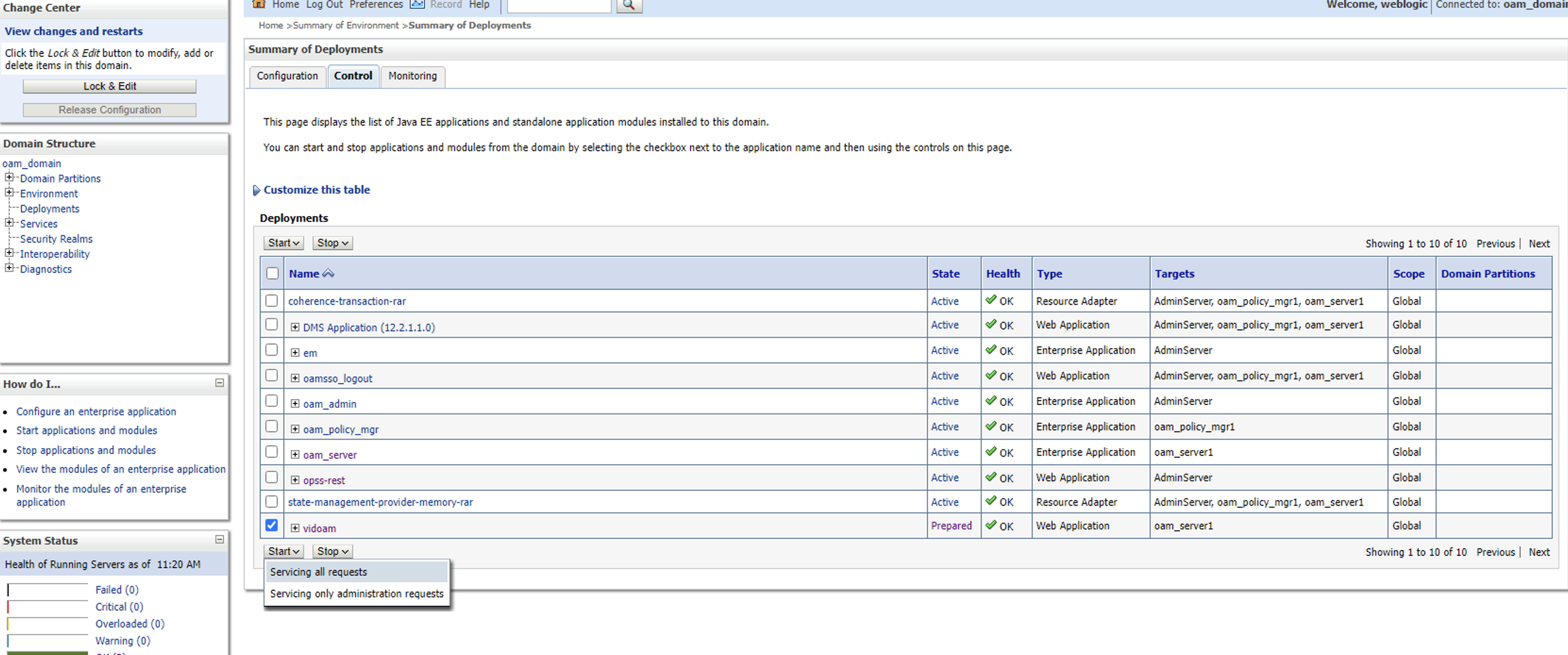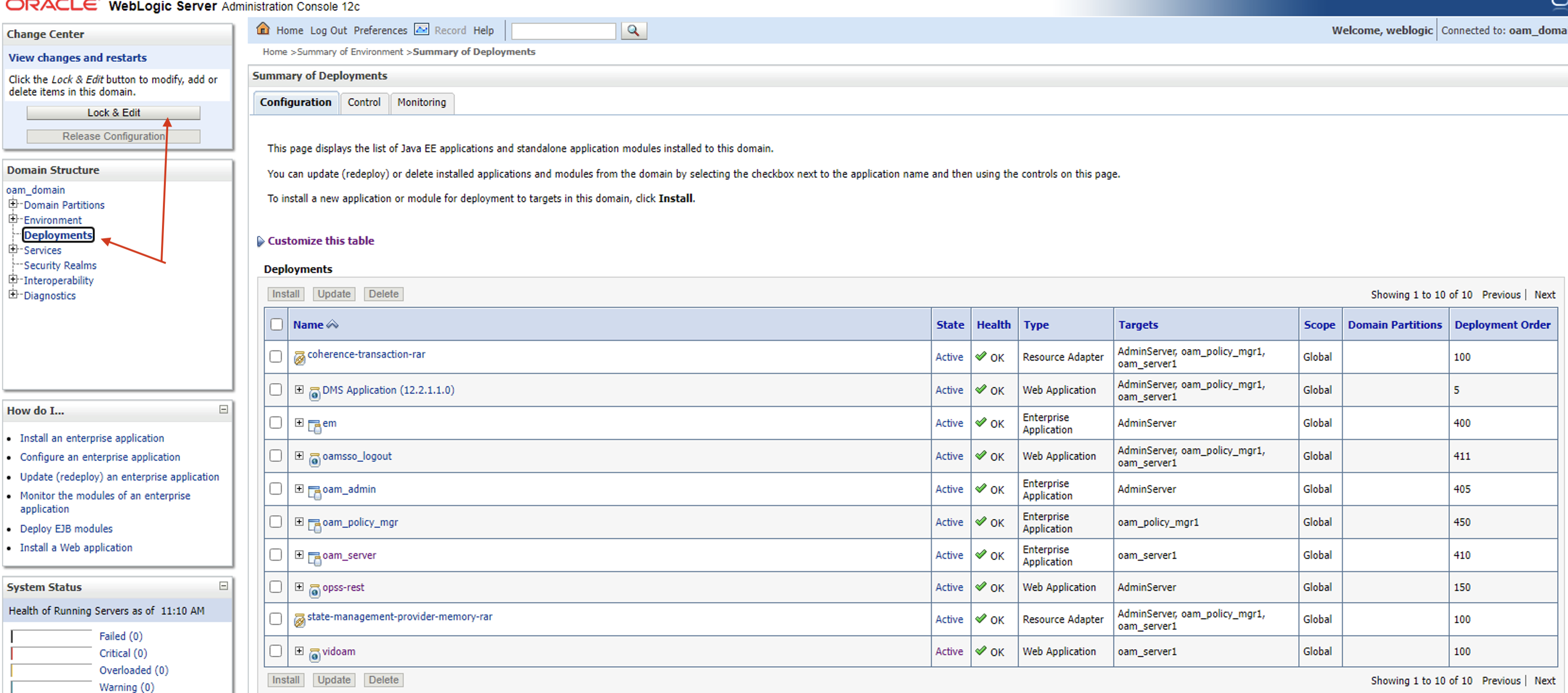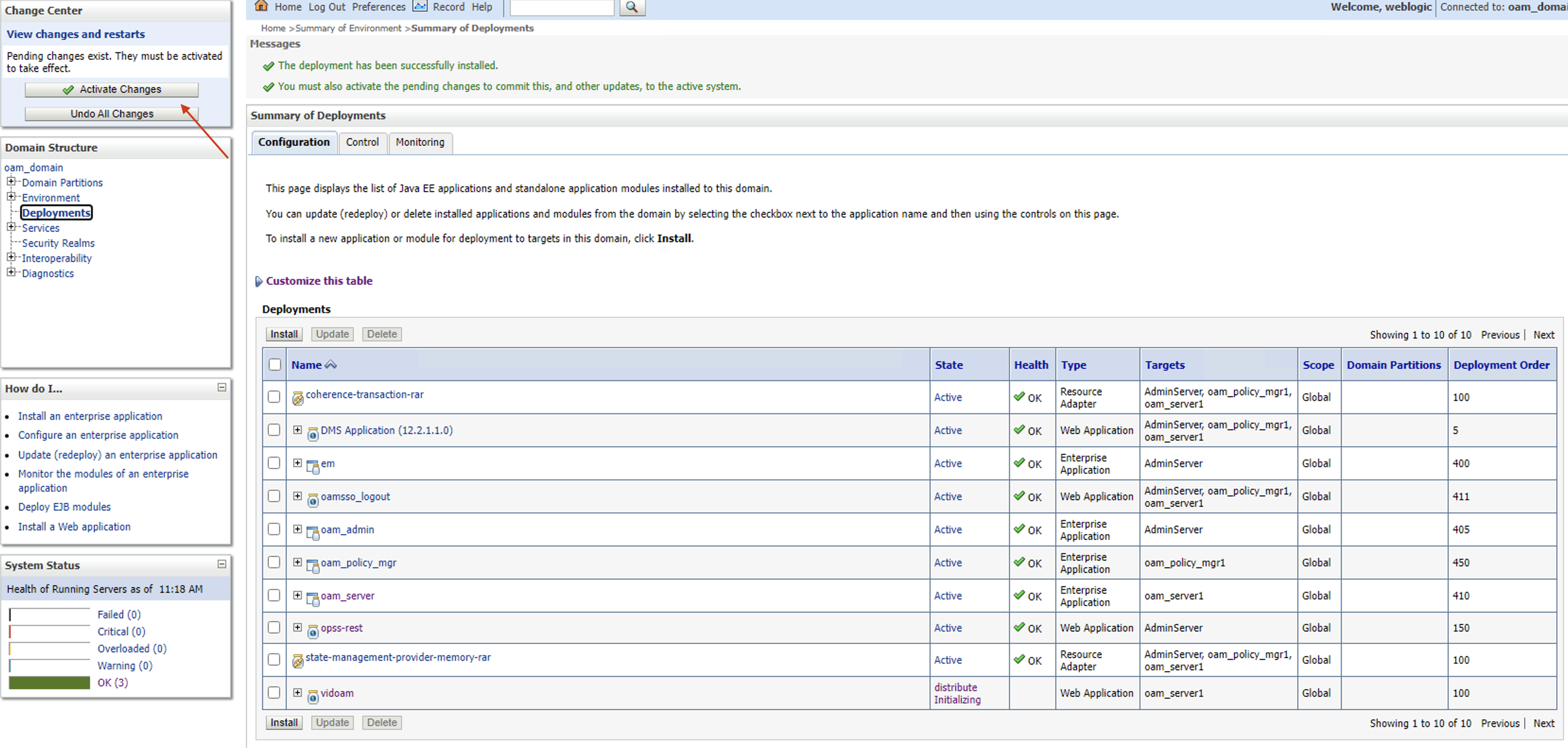 The installation procedure can be done in two ways. Through the web interface or wlst commands. If it is chosen through the web interface, the drawback would be that it must be done in two steps as described below.