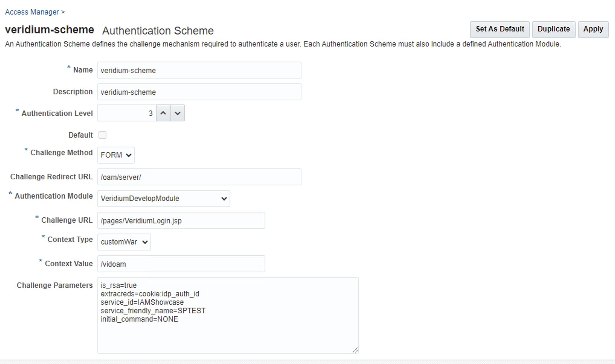 As you can see, we are using the Authentication Scheme that we just created. On Challenge Method chose FORM, challengeUrl is the relative path to our custom login page, Context Type is customWar because we have a custom interface and Context Value is WAR file name (we will cover the generation of this WAR in later steps)