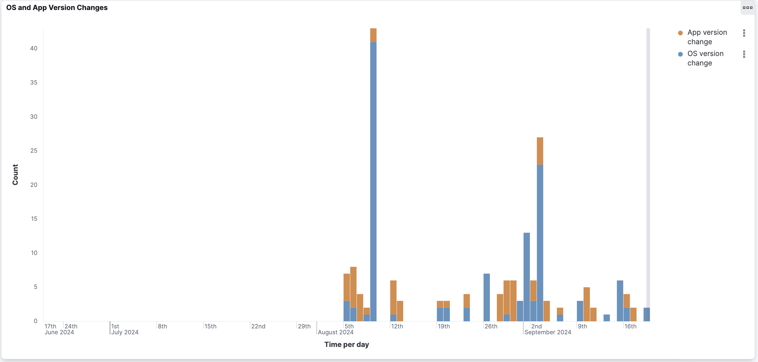 This chart presents the count of events where either the App version or the OS version of a phone device has changed.
