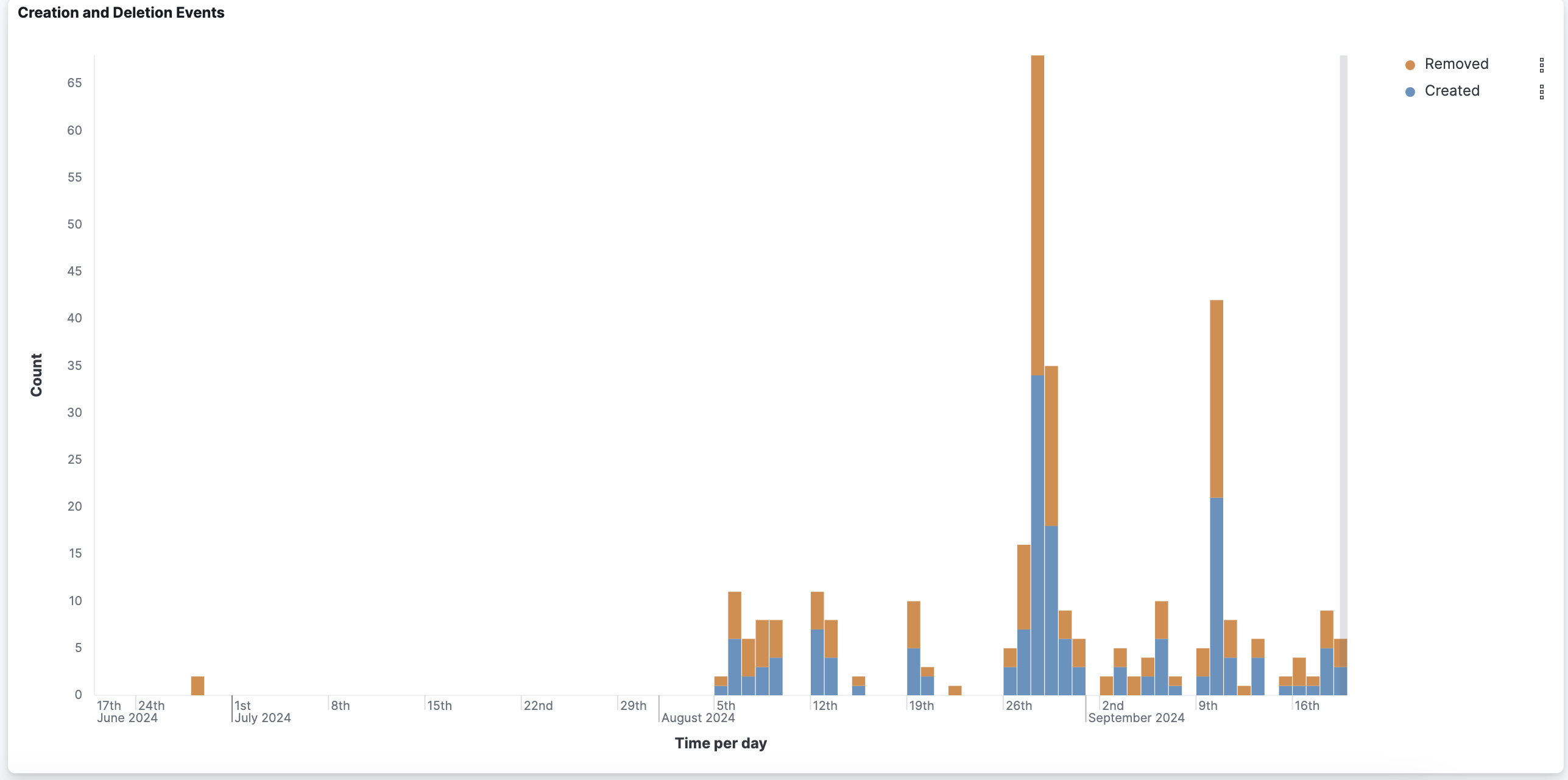 The following charts contain a bar chart for multiple types of events that happened on the devices during the dashboard’s selected time range.