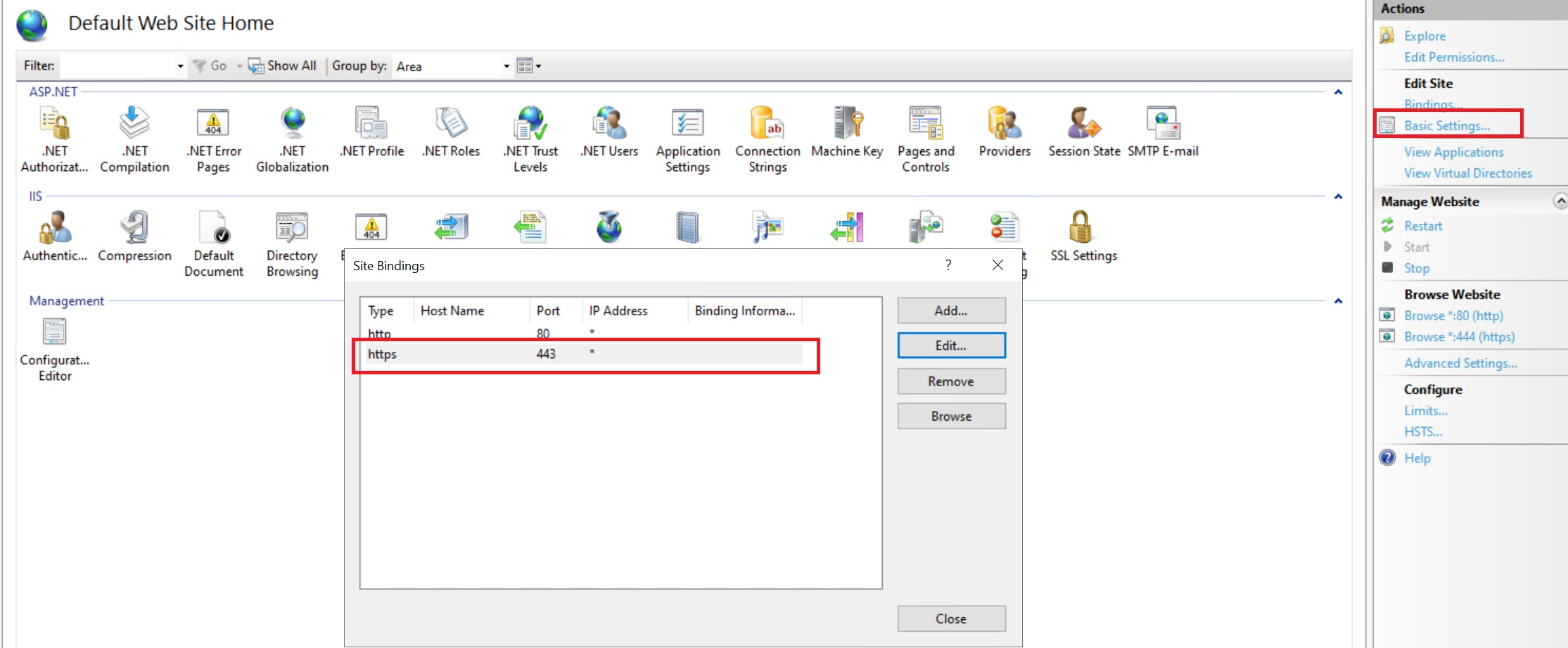 Before continue with the following step, you need to open IIS > Default Web Site > Bindings and make sure you have binding for port 443: