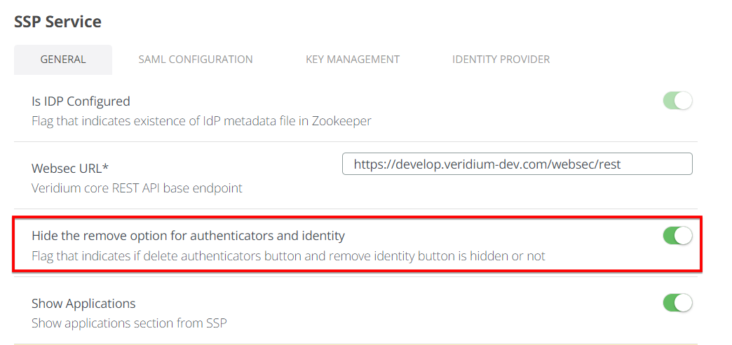 A new configuration option has been introduced in Veridium Manager / Services / SSP - “Hide the remove option for authenticators and identity” to allow (or not) the users to delete their own devices and identity.