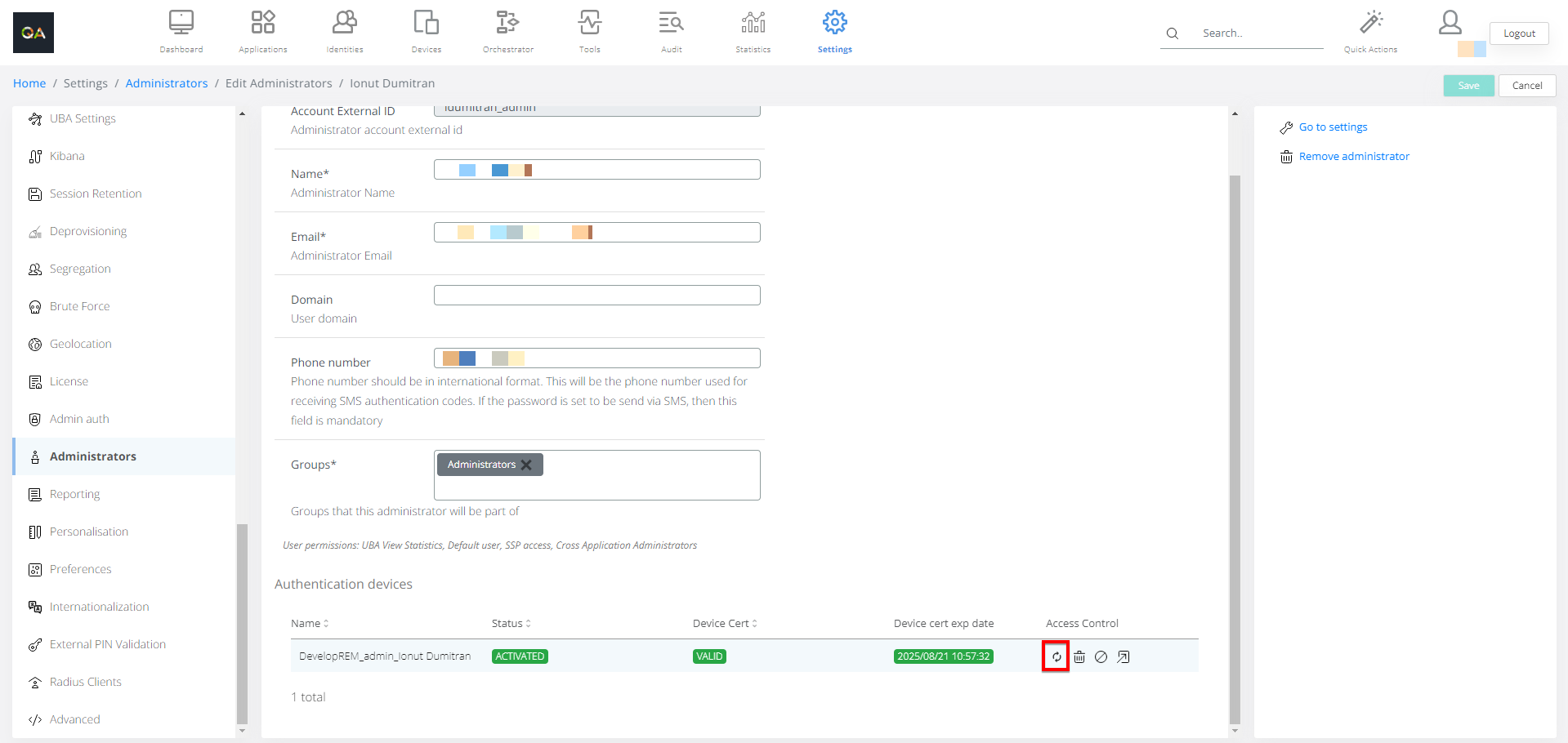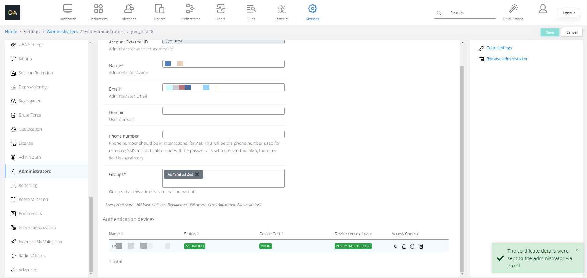 Choose how the cert receiver will receive the administrator certificate: email or download locally.