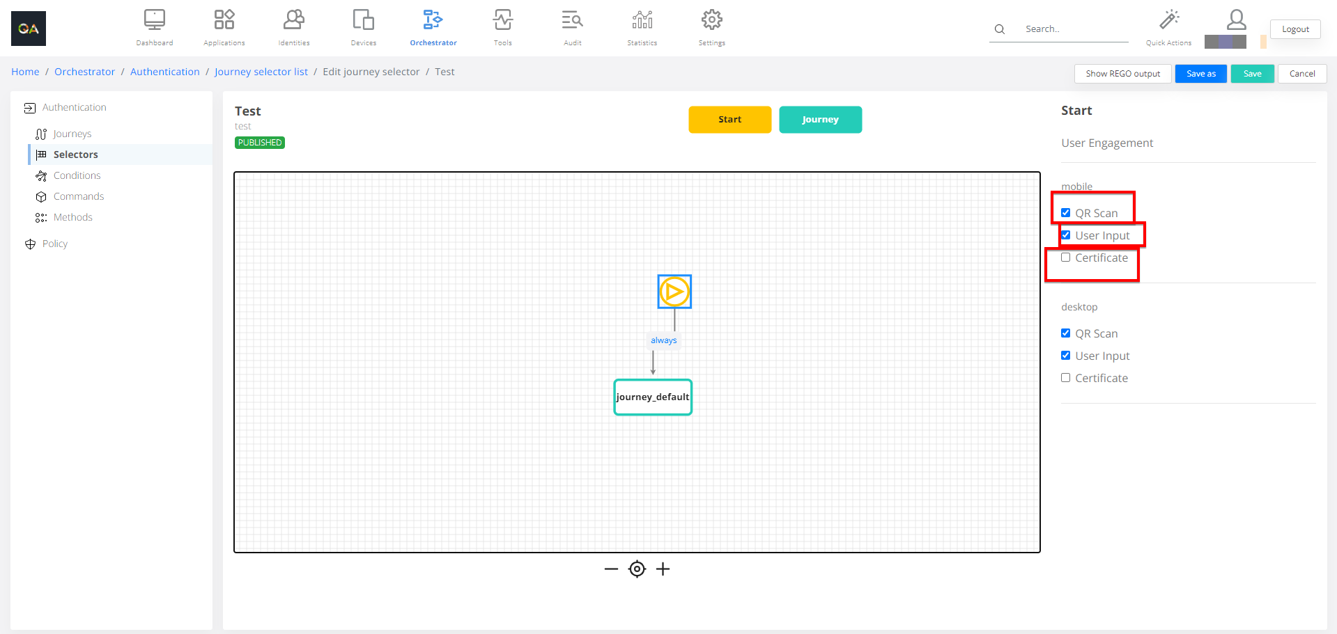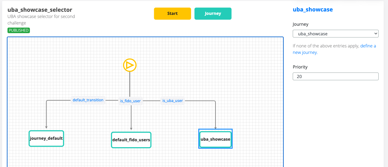 Transitions with conditions on them lead to journeys that can be chosen for the execution of the authentication. See Journey on how to define transitions.