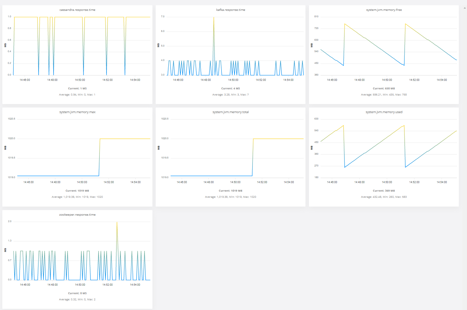 Resource monitoring includes Kafka, Zookeeper, Memory Usage and Response Times. Each table can be expanded by clicking on it: