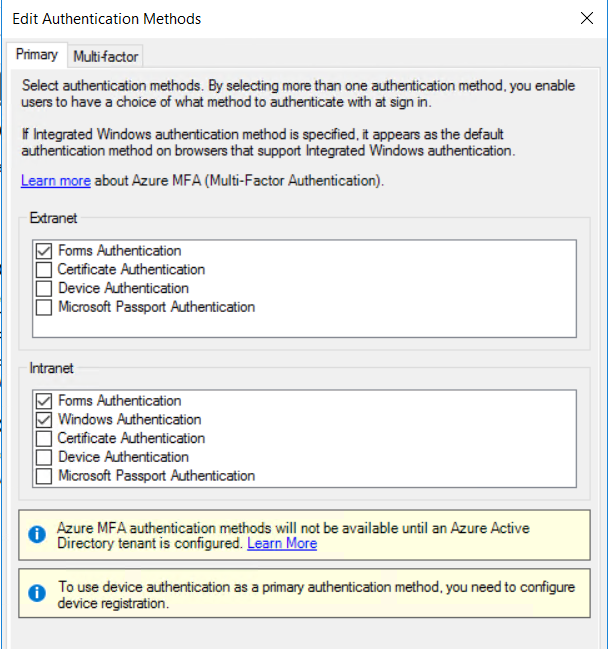 on the ADFS server to allow the proper UserAgents for Windows Integrated Authentication and enable Windows Authentication under Authentication Methods in Intranet section in ADFS administration console: