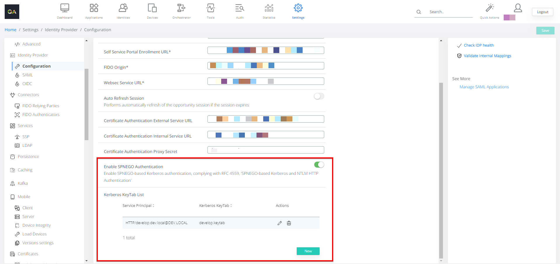 2. Enable SPNEGO authentication and click on New. Upload the Keytab generated and edit the Service Principal used to generate it and click on Add