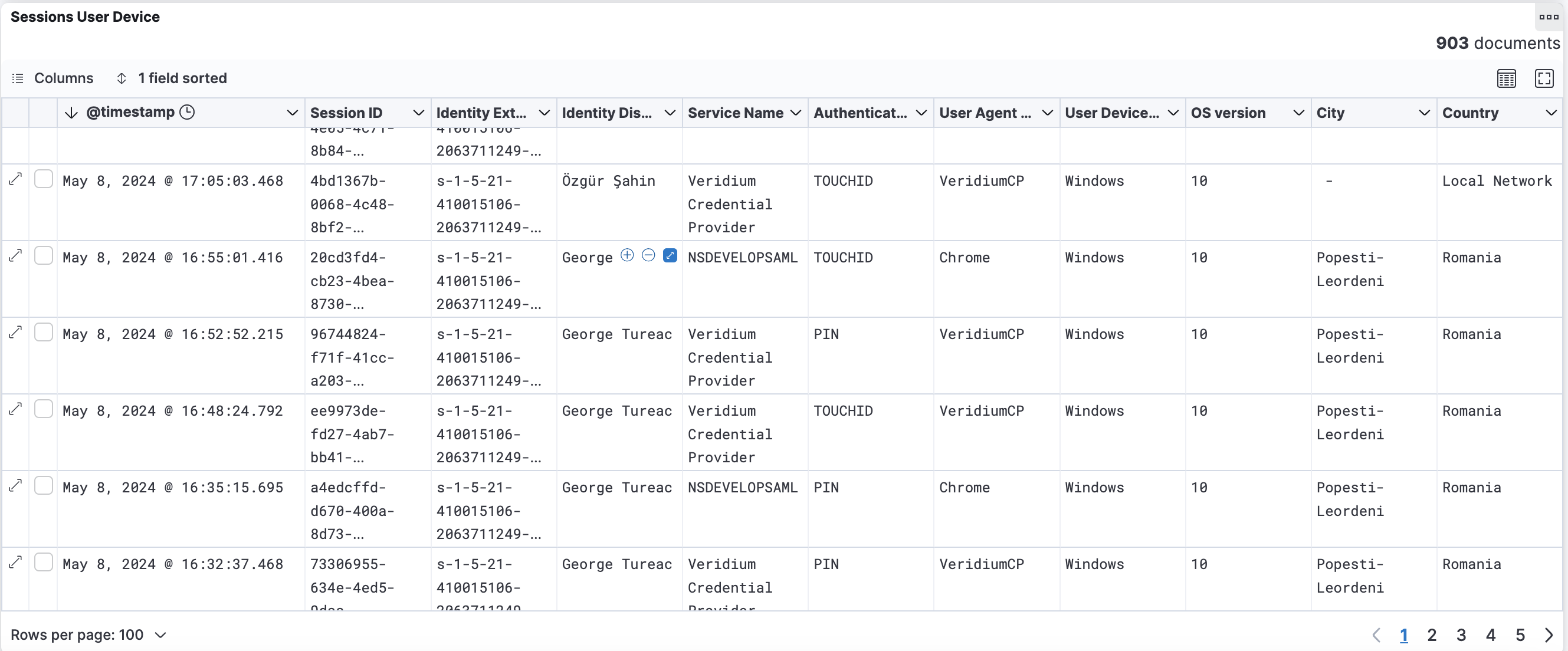 The “Sessions User Device” table provides a list of the sessions performed sorted by timestamp