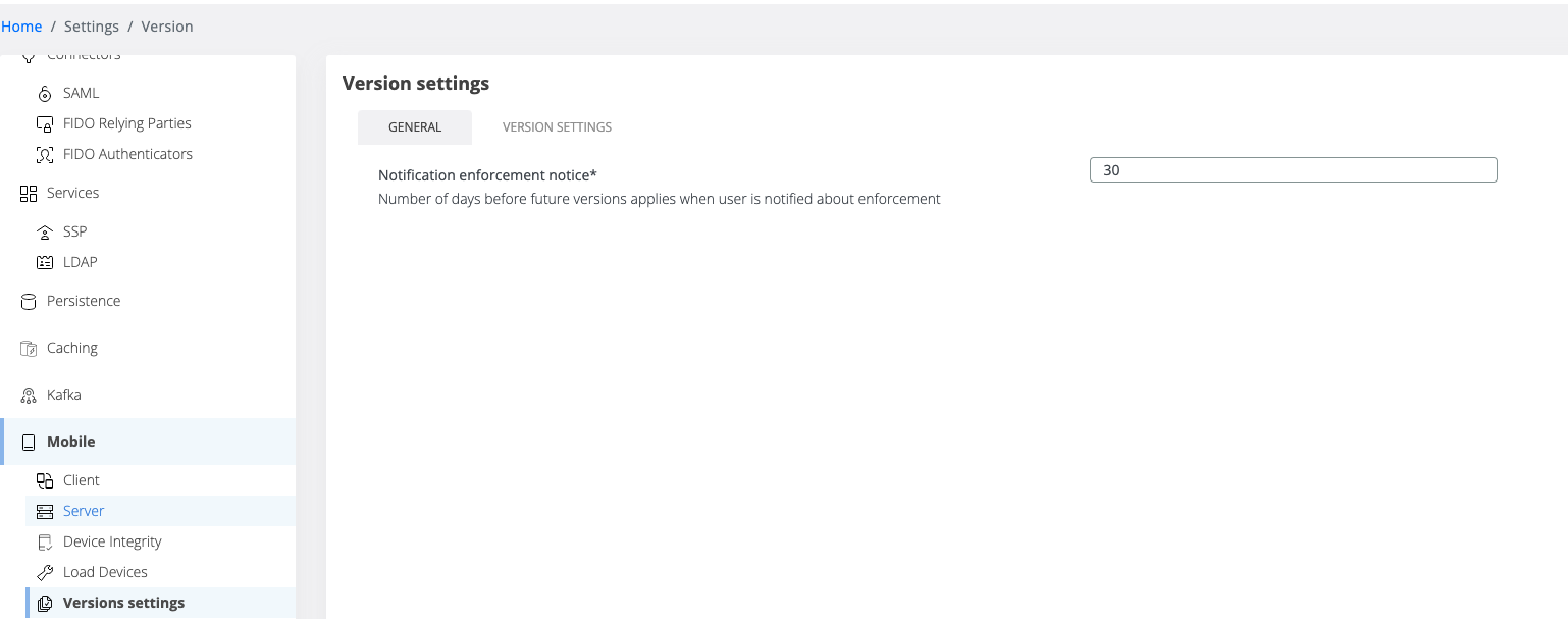 There is a new tab in Mobile section called Versions settings. From that section, you can administrate version enforcement for IOS and ANDROID.
