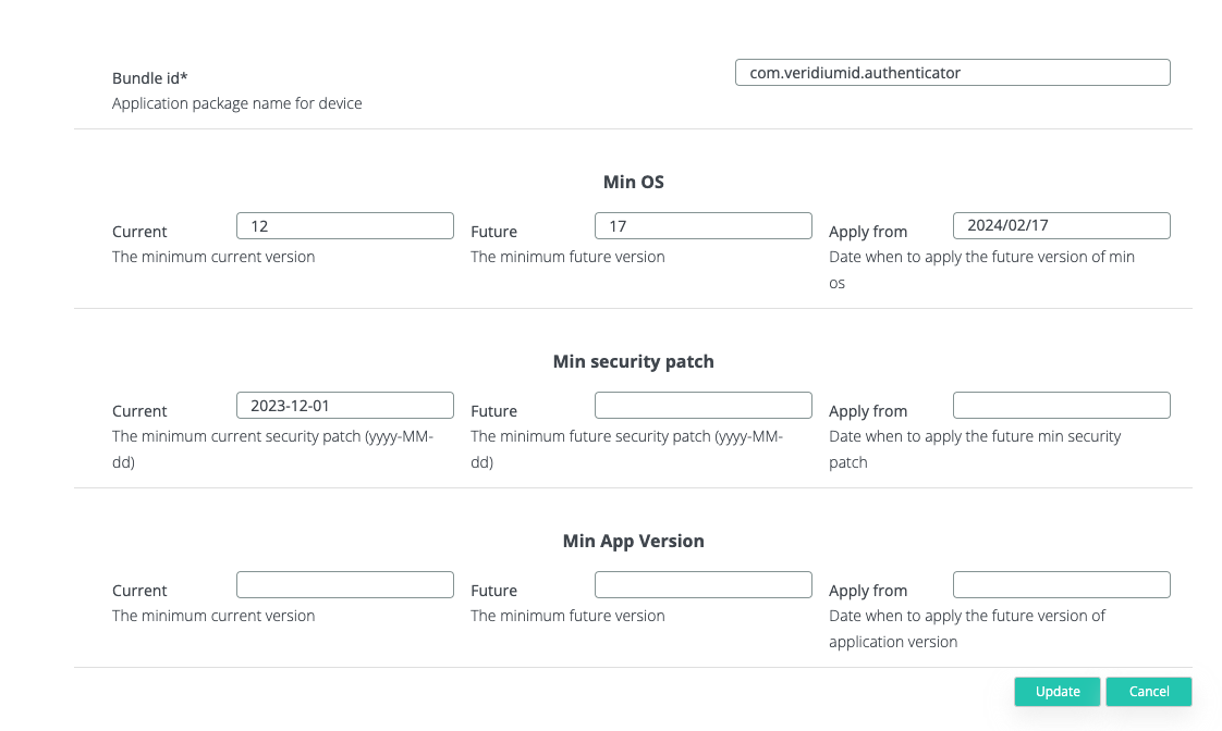 The two configurations, iOS and android, will have in common min os and min app version, and for iOS will be Min os build version, and for android, Min security patch.