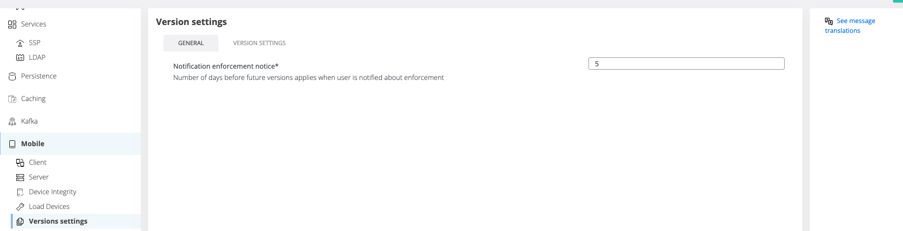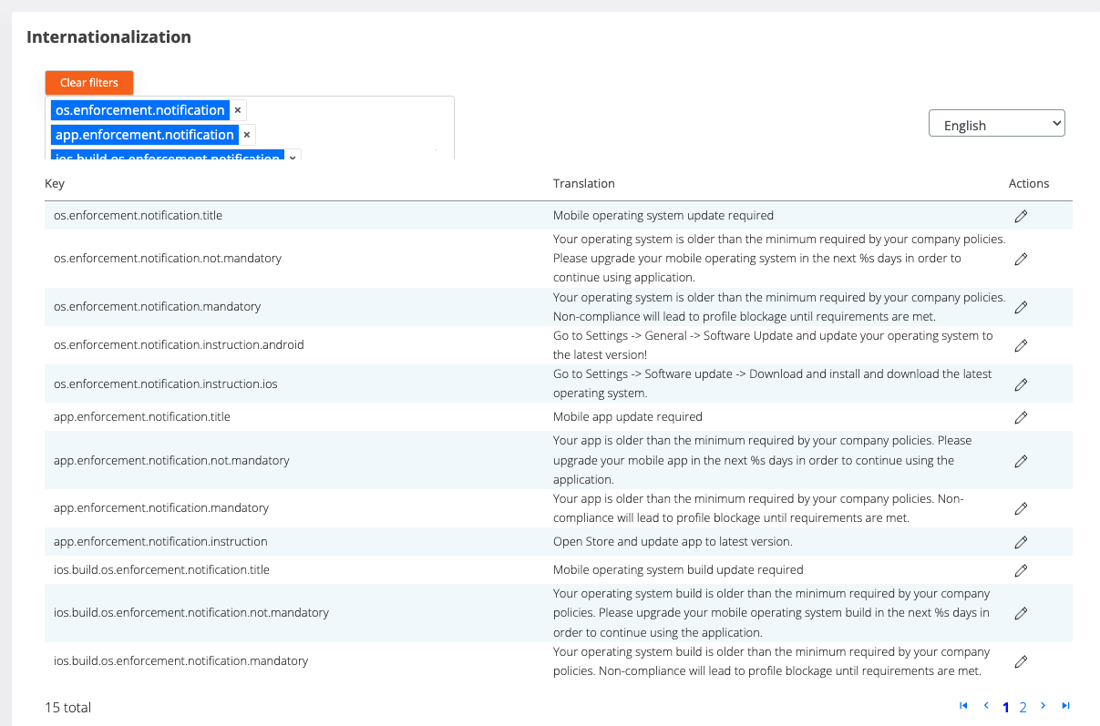 When user will press on See message translations the user will be redirected to Internationalization page with specific filters for translations used in Version enforcement notifications.