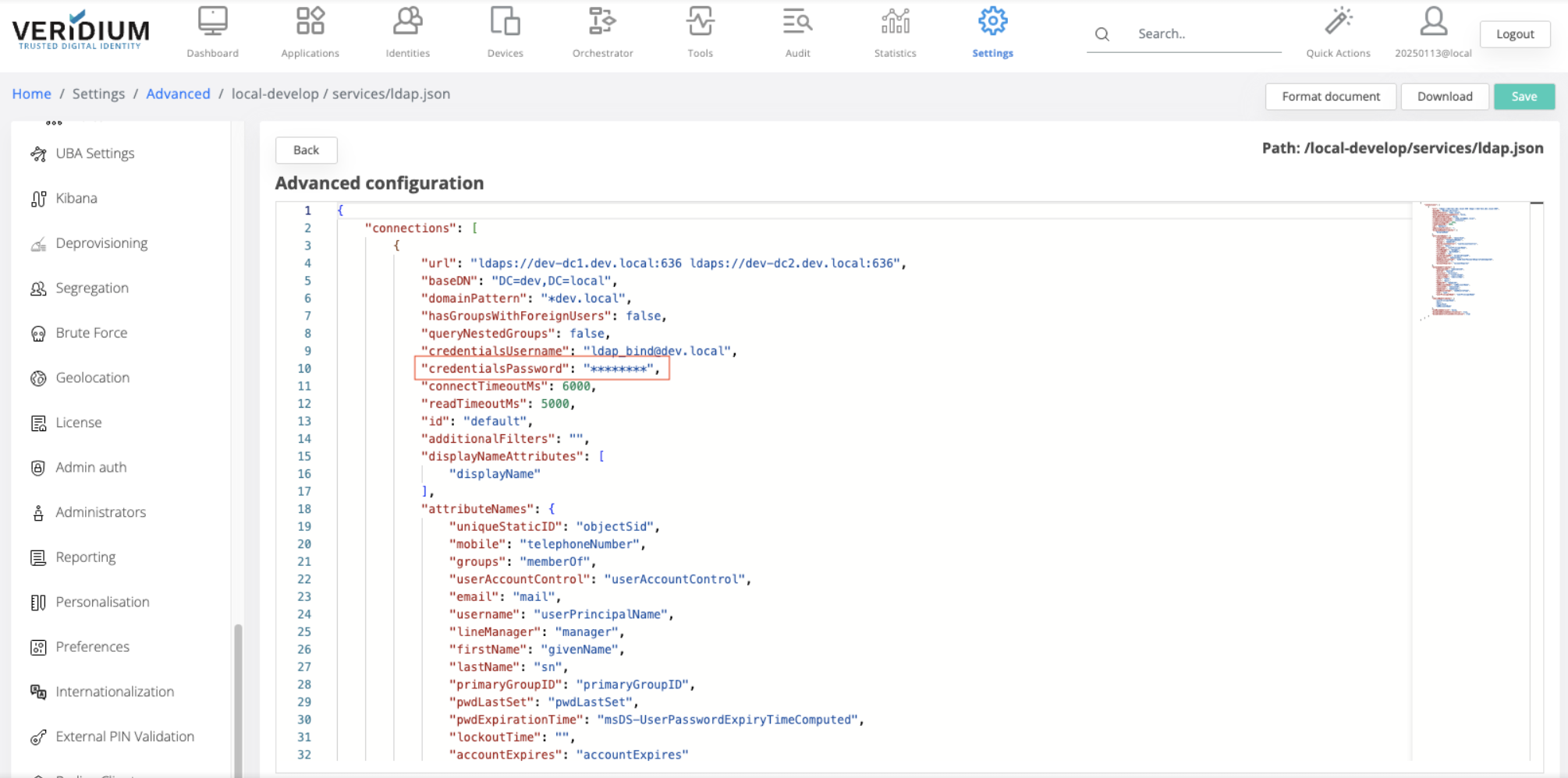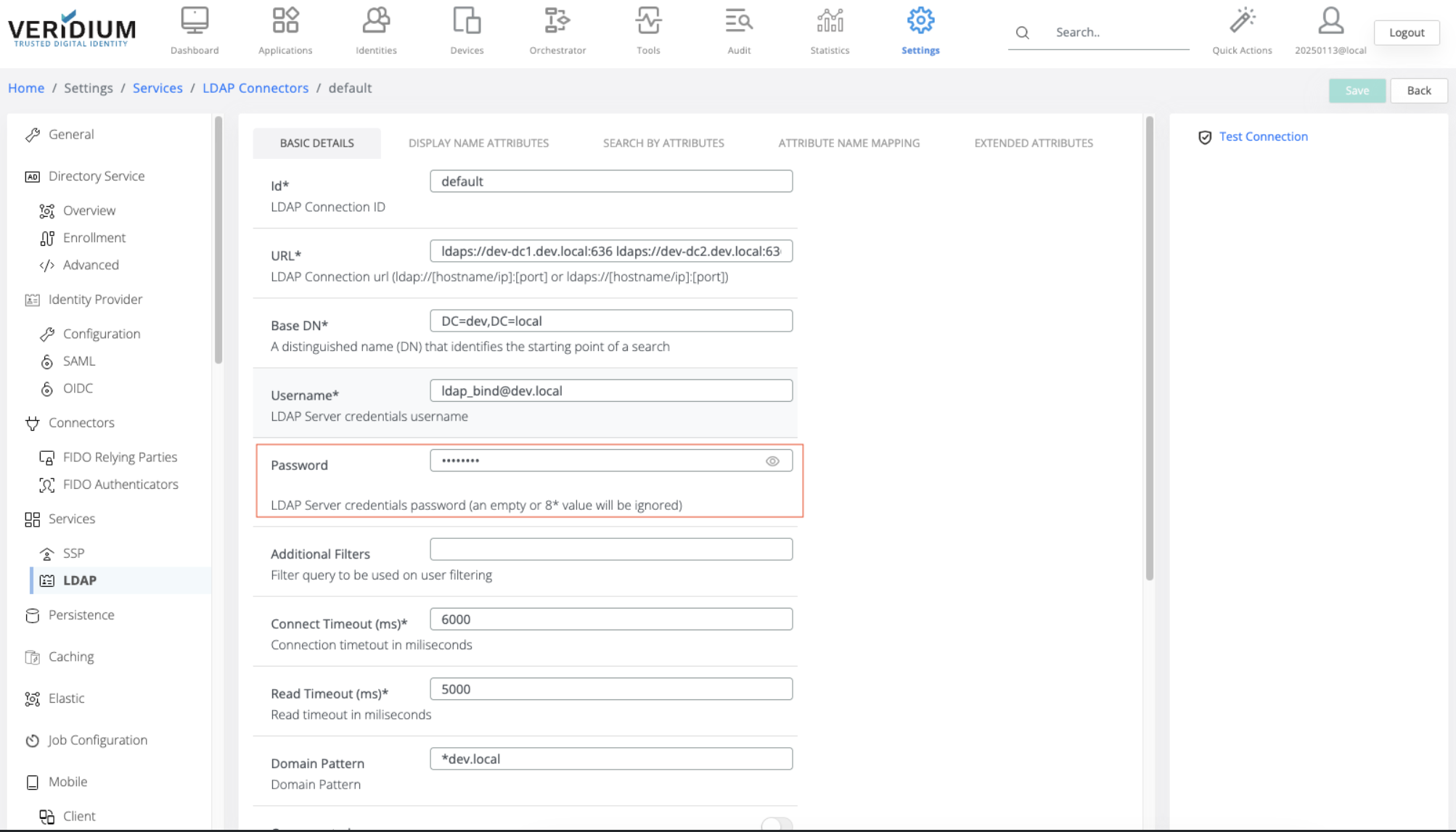 Secure Connection Testing: Connection tests (e.g., LDAP) utilize stored encrypted values, ensuring security without requiring repeated entry.